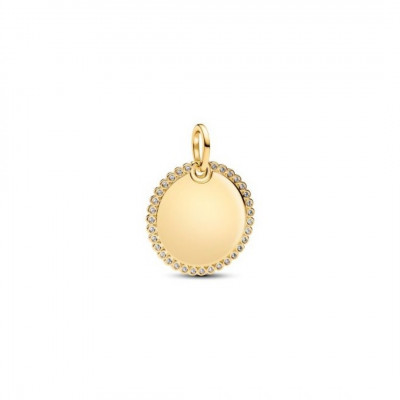 Engravable round 14k gold-plated dangle with clear cubic zirconia